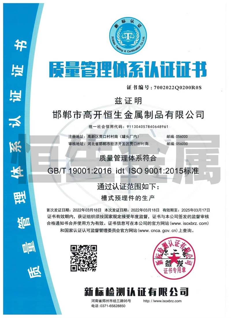 邯鄲市高開恒生金屬制品有限公司總部設在鋼城河北邯鄲,西鄰京廣線、東臨京深高速,地理位置優越,交通比較便利。 我廠擁有多年生產預埋槽道的產品生產經驗,專業生產鍍鋅防腐槽型預埋件系列產品,其中產品包括:高開恒生哈芬槽、哈芬槽鋼、預埋槽道、預埋滑槽、帶齒預埋槽鋼、槽式預埋件、工字鋼材料、C型槽材料配套的T型螺栓,也可根據客戶需求按圖訂做加工,產品廣泛應用于隧道、城市軌道交通、地下綜合管廊、建筑幕墻施工工程。